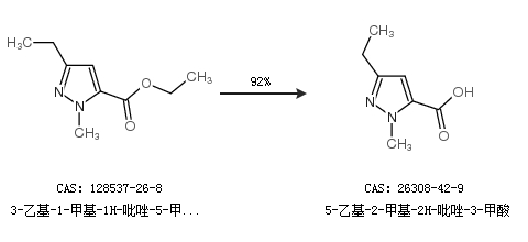 1.通过3-乙基-1-甲基-1H-吡唑-5-甲酸乙酯合成5-乙基-2-甲基-2H-吡唑-3-甲酸,收率约92%;