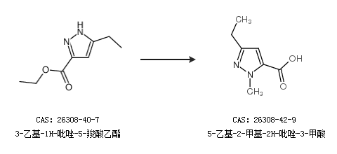 2.通过3-乙基-1H-吡唑-5-羧酸乙酯合成5-乙基-2-甲基-2H-吡唑-3-甲酸