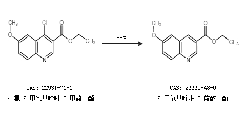 1.通过4-氯-6-甲氧基喹啉-3-甲酸乙酯合成6-甲氧基喹啉-3-羧酸乙酯,收率约88%;