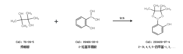 2.通过频哪醇和2-羟基苯硼酸合成2-(4,4,5,5-四甲基-1,3,2-二杂氧戊硼烷-2-基)苯酚,收率约91%;