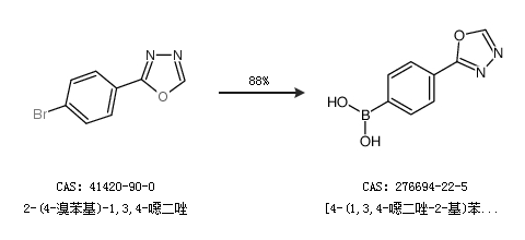 2.通过2-(4-溴苯基)-1,3,4-噁二唑合成[4-(1,3,4-噁二唑-2-基)苯基]硼酸,收率约88%;