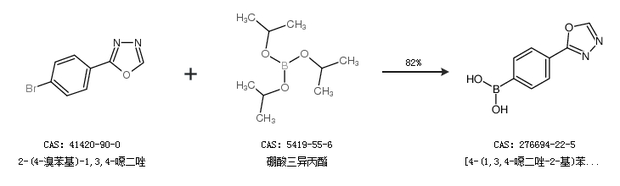 1.通过2-(4-溴苯基)-1,3,4-噁二唑和硼酸三异丙酯合成[4-(1,3,4-噁二唑-2-基)苯基]硼酸,收率约82%;