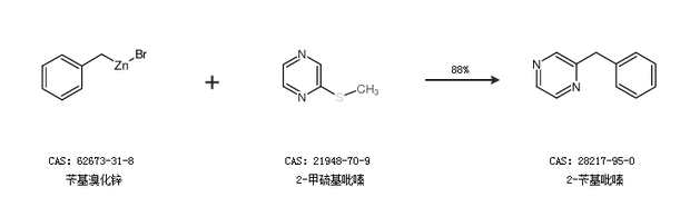 1.通过苄基溴化锌和2-甲硫基吡嗪合成2-苄基吡嗪,收率约88%;