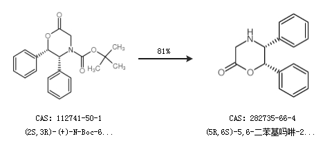 1.通过(2S,3R)-(+)-N-Boc-6-氧代-2,3-二苯基吗啉合成(5R,6S)-5,6-二苯基吗啉-2-酮,收率约81%;