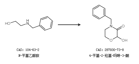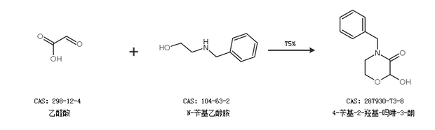 1.通过乙醛酸和N-苄基乙醇胺合成4-苄基-2-羟基-吗啉-3-酮,收率约75%;