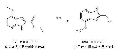 1.通过5-苄氧基-4-氮杂吲哚-2-羧酸合成2-甲醇-4-甲氧基-7-氮杂吲哚,收率约95%;