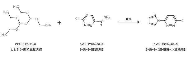 2.通过1,1,3,3-四乙氧基丙烷和3-氯-6-肼基哒嗪合成3-氯-6-(1H-吡唑-1-基)哒嗪,收率约88%;