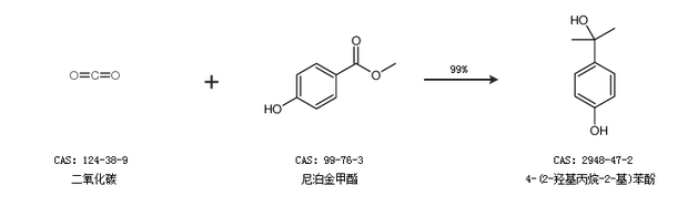 1.通过二氧化碳和尼泊金甲酯合成4-(2-羟基丙烷-2-基)苯酚,收率约99%;