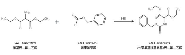 1.通过氨基丙二酸二乙酯和氯甲酸苄酯合成2-(苄氧基羰基氨基)丙二酸二乙酯,收率约98%;