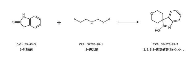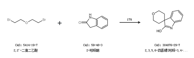 2.通过2,2''-二溴二乙醚和2-吲哚酮合成2,3,5,6-四氢螺[吲哚-3,4-吡喃]-2(1H)-酮,收率约17%;