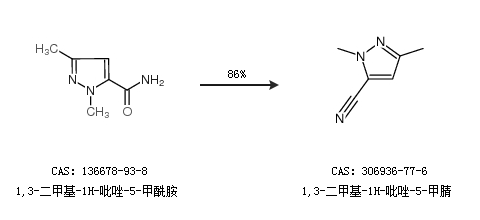 1.通过1,3-二甲基-1H-吡唑-5-甲酰胺合成1,3-二甲基-1H-吡唑-5-甲腈,收率约86%;