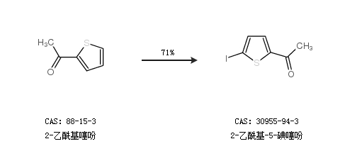 1.通过2-乙酰基噻吩合成2-乙酰基-5-碘噻吩,收率约71%;