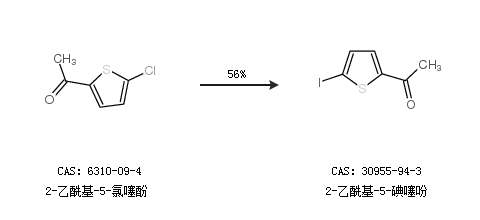 2.通过2-乙酰基-5-氯噻酚合成2-乙酰基-5-碘噻吩,收率约56%;