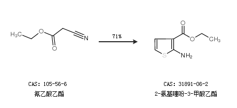 2.通过氰乙酸乙酯合成2-氨基噻吩-3-甲酸乙酯,收率约71%;