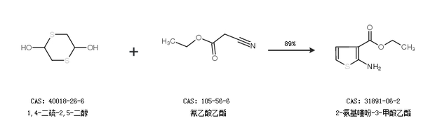 1.通过1,4-二硫-2,5-二醇和氰乙酸乙酯合成2-氨基噻吩-3-甲酸乙酯,收率约89%;