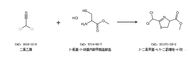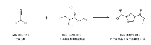 1.通过二氯乙腈和L-半胱氨酸甲酯盐酸盐合成2-二氯甲基-4,5-二氢噻唑-4-羧酸甲酯