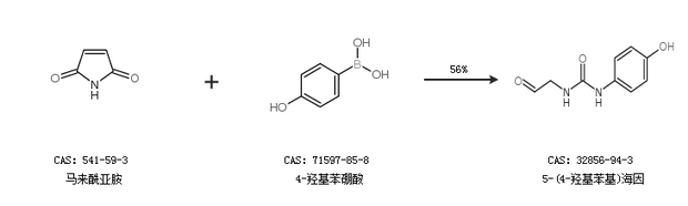 1.通过马来酰亚胺和4-羟基苯硼酸合成5-(4-羟基苯基)海因,收率约56%;