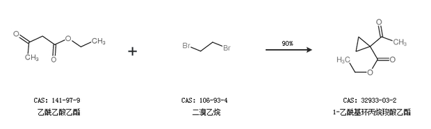 1.通过乙酰乙酸乙酯和二溴乙烷合成1-乙酰基环丙烷羧酸乙酯,收率约90%;