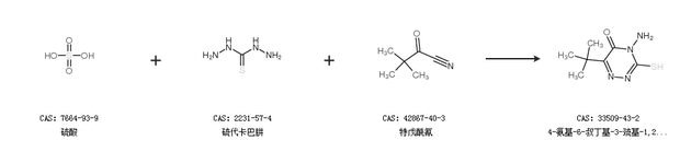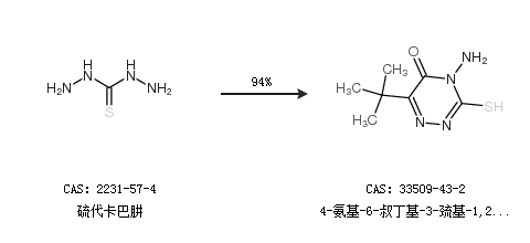 1.通过硫代卡巴肼合成4-氨基-6-叔丁基-3-巯基-1,2,4-三嗪-5(4H)-酮,收率约94%;