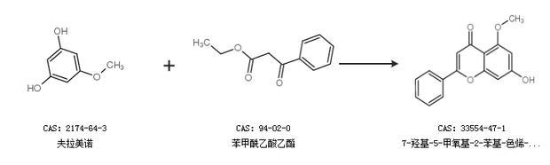 1.通过夫拉美诺和苯甲酰乙酸乙酯合成7-羟基-5-甲氧基-2-苯基-色烯- 4-酮