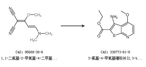 1.通过1,1-二氰基-2-甲氧基-4-二甲基氨基-1,3-丁二烯合成3-氨基-4-甲氧基噻吩并[2,3-b]吡啶-2-羧酸乙酯