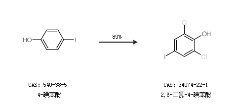 2.通过4-碘苯酚合成2,6-二氯-4-碘苯酚,收率约89%;