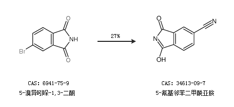 1.通过5-溴异吲哚-1,3-二酮合成5-氰基邻苯二甲酰亚胺,收率约27%;