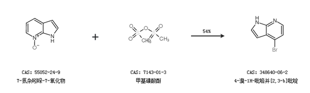 2.通过7-氮杂吲哚-7-氧化物和甲基磺酸酐合成4-溴-1H-吡咯并[2,3-b]吡啶,收率约54%;