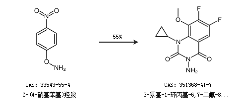 2.通过O-(4-硝基苯基)羟胺合成3-氨基-1-环丙基-6,7-二氟-8-甲氧基-2,4(1h,3h)-喹唑啉二酮,收率约55%;