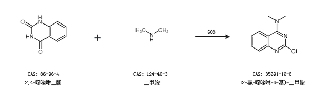 2.通过2,4-喹唑啉二酮和二甲胺合成(2-氯-喹唑啉-4-基)-二甲胺,收率约60%;