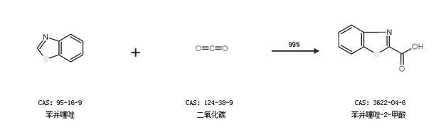 1.通过苯并噻唑和二氧化碳合成苯并噻唑-2-甲酸,收率约99%;