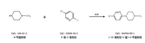 2.通过N-甲基哌嗪和5-溴-2-氯吡啶合成1-(5-溴吡啶-2-基)-4-甲基哌嗪,收率约63%;