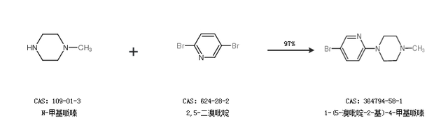 1.通过N-甲基哌嗪和2,5-二溴吡啶合成1-(5-溴吡啶-2-基)-4-甲基哌嗪,收率约97%;