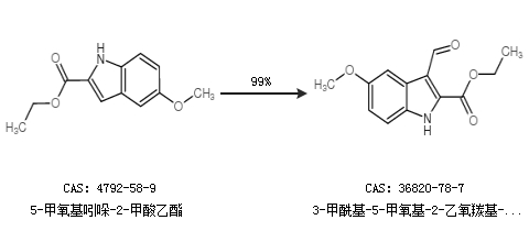 1.通过5-甲氧基吲哚-2-甲酸乙酯合成3-甲酰基-5-甲氧基-2-乙氧羰基-1H-吲哚,收率约99%;
