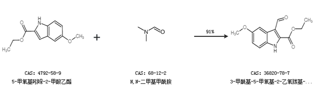 2.通过5-甲氧基吲哚-2-甲酸乙酯和N,N-二甲基甲酰胺合成3-甲酰基-5-甲氧基-2-乙氧羰基-1H-吲哚,收率约91%;
