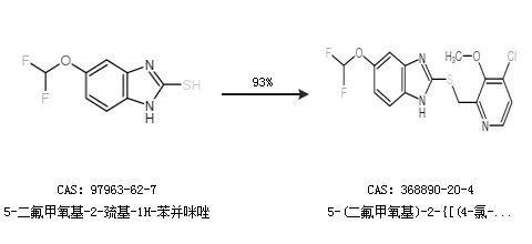 2.通过5-二氟甲氧基-2-巯基-1H-苯并咪唑合成5-(二氟甲氧基)-2-{[(4-氯-3-甲氧基-2-吡啶基)甲基]硫}-1氢-苯并咪唑,收率约93%;