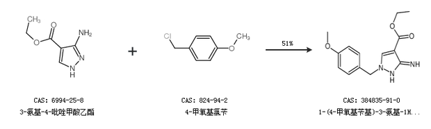 1.通过3-氨基-4-吡唑甲酸乙酯和4-甲氧基氯苄合成1-(4-甲氧基苄基)-3-氨基-1H-吡唑-4-羧酸乙酯,收率约51%;
