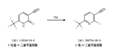 1.通过2-羟基-6-三氟甲基烟腈合成2-氯-6-三氟甲基烟腈,收率约75%;