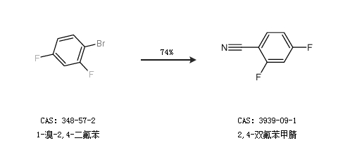 2.通过1-溴-2,4-二氟苯合成2,4-双氟苯甲腈,收率约74%;