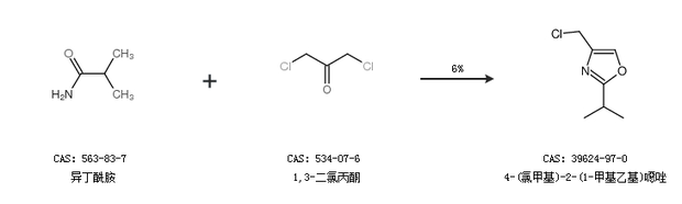 1.通过异丁酰胺和1,3-二氯丙酮合成4-(氯甲基)-2-(1-甲基乙基)噁唑,收率约6%;