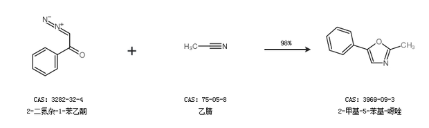 1.通过2-二氮杂-1-苯乙酮和乙腈合成2-甲基-5-苯基-噁唑,收率约98%;