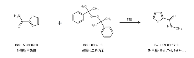 1.通过2-噻吩甲酰胺和过氧化二异丙苯合成N-甲基-(6ci,7ci,9ci)-2-噻吩羧酰胺,收率约77%;