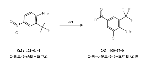 1.通过2-氨基-5-硝基三氟甲苯合成2-氯-4-硝基-6-(三氟甲基)苯胺,收率约94%;