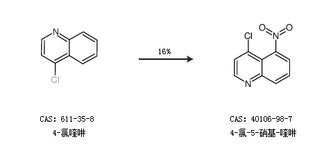 1.通过4-氯喹啉合成4-氯-5-硝基-喹啉,收率约16%;
