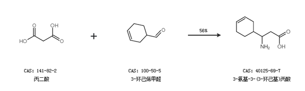 1.通过丙二酸和3-环己烯甲醛合成3-氨基-3-(3-环己基)丙酸,收率约56%;