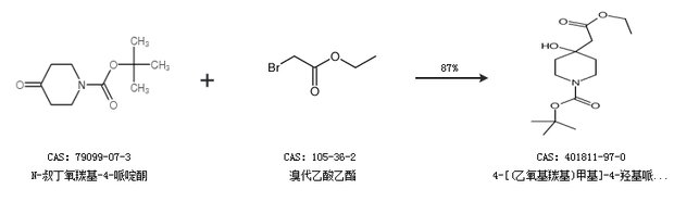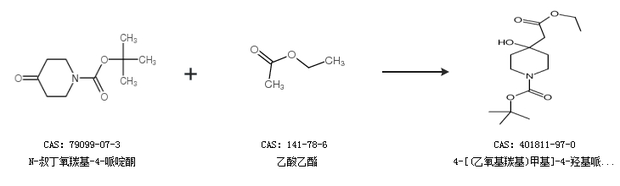 2.通过N-叔丁氧羰基-4-哌啶酮和乙酸乙酯合成4-[(乙氧基羰基)甲基]-4-羟基哌啶-1-羧酸叔丁酯