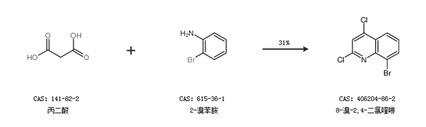 1.通过丙二酸和2-溴苯胺合成8-溴-2,4-二氯喹啉,收率约31%;