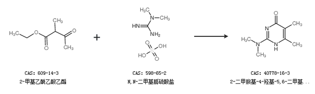 1.通过2-甲基乙酰乙酸乙酯和N,N-二甲基胍硫酸盐合成2-二甲胺基-4-羟基-5,6-二甲基嘧啶