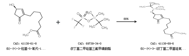 2.通过(R)-(+)-3-羟基-5-氧代-1-环戊烯-1-庚酸甲酯和叔丁基二甲硅基三氟甲磺酸酯合成(R)-(+)-3-(叔丁基二甲基硅氧基)-5-氧代-1-环戊烯基-1-己酸甲酯,收率约88%;