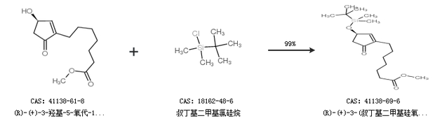 1.通过(R)-(+)-3-羟基-5-氧代-1-环戊烯-1-庚酸甲酯和叔丁基二甲基氯硅烷合成(R)-(+)-3-(叔丁基二甲基硅氧基)-5-氧代-1-环戊烯基-1-己酸甲酯,收率约99%;